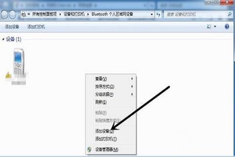 4.然后笔记本蓝牙功能开启后我们再次双击Bluetooth网络连接此时会弹出一个添加设备的窗口,右键任意空白处,会弹出右键菜单栏,下载菜单页面里的添加设备选项;