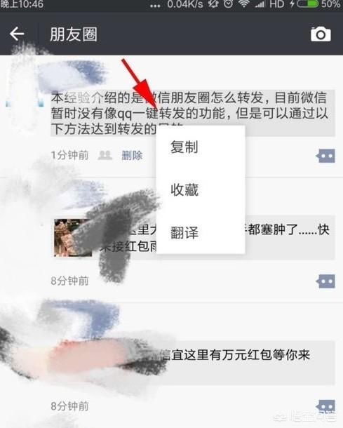 步骤1、选择要转发的朋友圈,长按住文字,选择复制;