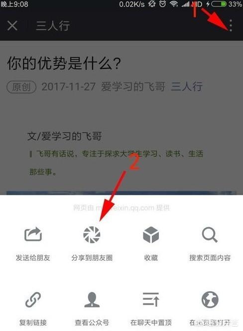 步骤3、择要转发的链接文章并点击进去,然后点击右上角三个小点的位置,选择分享到朋友圈;