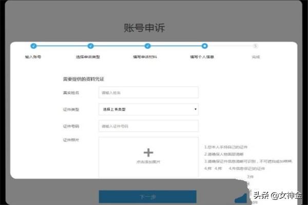 6、需要提供的资料凭证,填写真实姓名、证件号、上传证件照片,进入下一步。