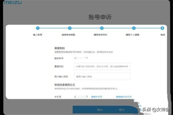7、重置Flyme 账号,输入新的Flyme 账号密码和手机号码,点击确认完成后,申诉结果会在24小时内短信发送至你的手机上。