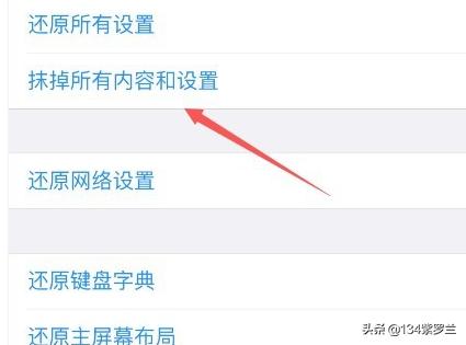 4、进入还原后,可以看到多个可还原的功能,我们选择第二个“抹掉所有内容和设置”,如图所示。通过上面的操作就可以将手机成功的恢复出厂设置,上面就是通过手机恢复出厂设置的方法。