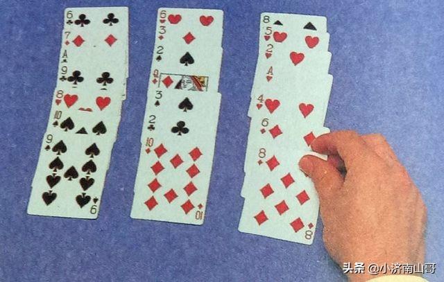 4.最后,收起剩下一列,放到其他两叠牌上面,记住下面这条金科玉律:选中的一列必须放在另两列的中间。图4