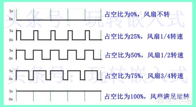 当占空比为50%的时候,对应一半的电压,此时风扇以最高转速的一半运转;