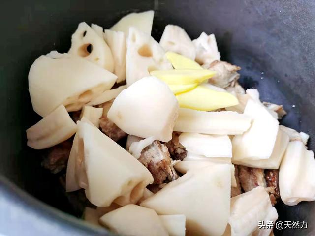 4、把切好的莲藕和姜片也放进电压力锅内,然后加入食材1.5-2倍左右的开水进去,盖上盖子压制50分钟即可,压好后再加入适量的盐调味即可。