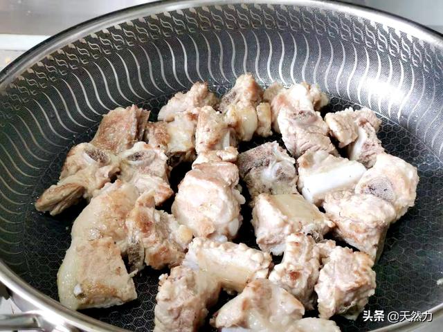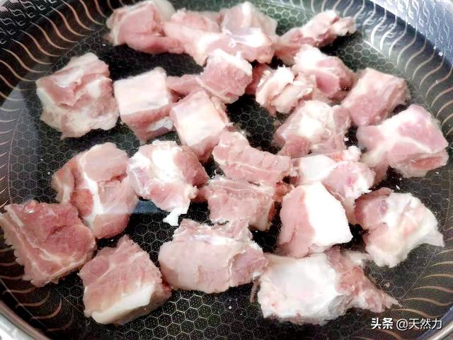 1、排骨冷水下锅开始焯水,这样可以把排骨中的血水排出,达到去除腥味的效果,水沸腾后再煮3分钟即可捞出,用开水把排骨外表的泡沫和杂质冲洗干净,然后控干水分备用。