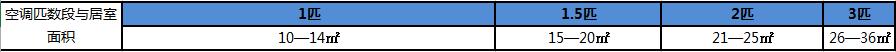 空调匹数与居室面积对照表: