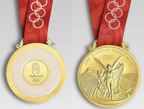 北京2008年奥运会金牌直径为70毫米,厚6毫米。金牌正面为国际奥委会统一规定的图案,插上翅膀站立的希腊胜利女神和希腊潘纳辛纳科竞技场。金牌背面镶嵌着取自中国古代龙纹玉璧造型的玉璧,背面正中的金属图形上镌刻着北京奥运会会徽。