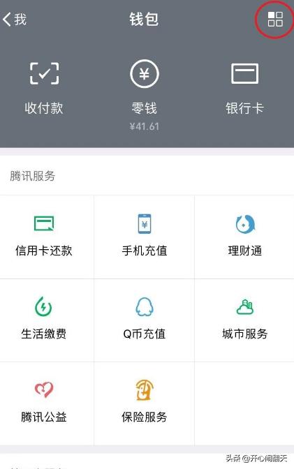2、在“钱包”页面中,点击页面右上角的“四个方块”的图标按钮。进入“支付中心”页面。