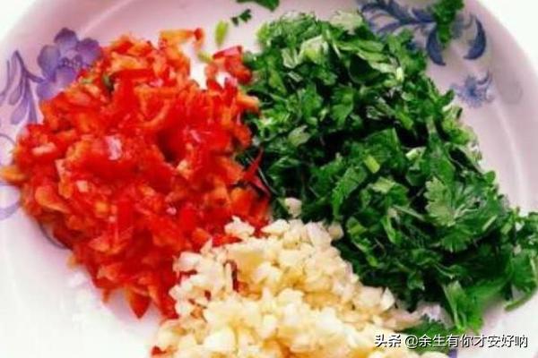 2.香菜洗净切段,红椒切碎,大蒜切碎,葱切碎备用。