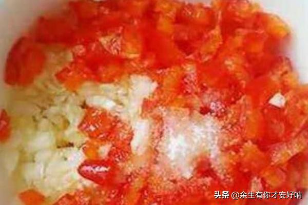 3.开水调汁:准备一个碗,把切好的红椒和一半的蒜末放入碗中,用热油激出辣椒和蒜的香味。
