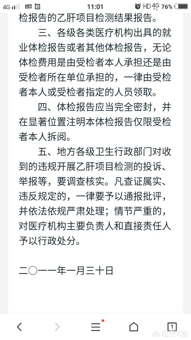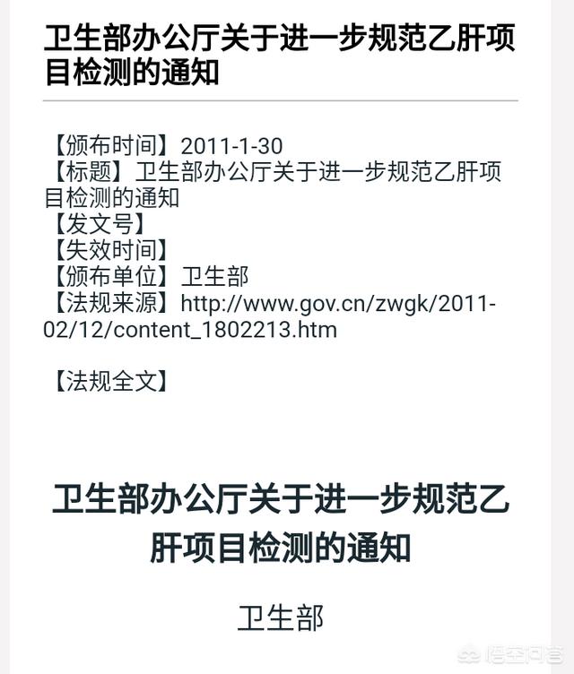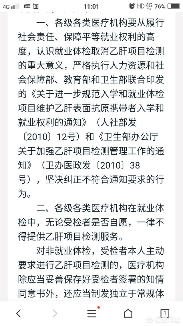 2011年1月30日,卫生部下发文件《关于进一步规范乙肝项目检测》的通知,明确规定:医疗机构(医院、疾控中心、体检机构)禁止入职体检乙肝项目检查,受检者“自愿与不自愿”都不允许查,否则重罚。