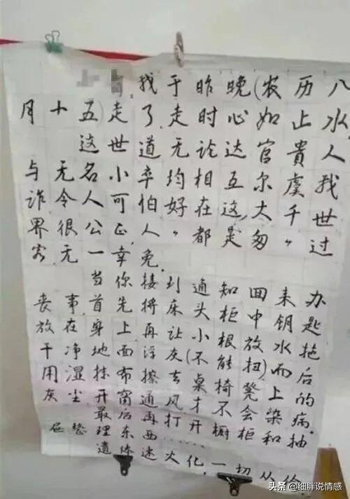 在遗书里老人以冷到极致的语言,向儿子交待了:死亡的时间,人生感悟,老人去世后细致到房间怎样打扫……