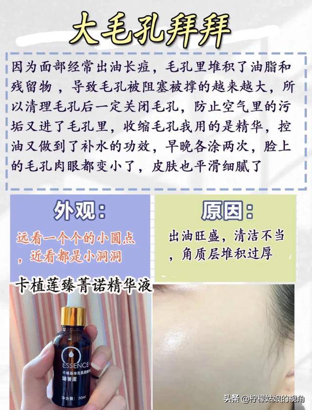 油皮女孩一般都会有毛孔粗大的问题。尤其是脸上痘痘多的妹子毛孔更容易粗大,这个卡植莲臻菁诺收缩毛孔的精华是我长期用下来觉得效果的确不错的一个,质地清爽好吸收,不会油腻闷痘,️个月毛孔真的肉眼可见的细腻了