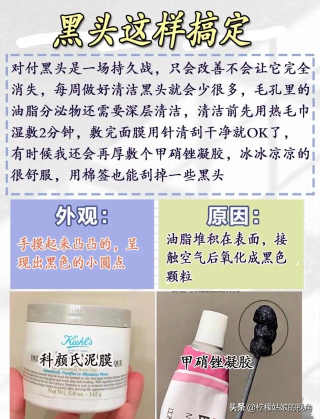 鼻子上的黑头千万不要去挤,会把毛孔挤的更大的,我是用科颜氏清洁泥膜和甲硝锉凝胶一起去黑头的