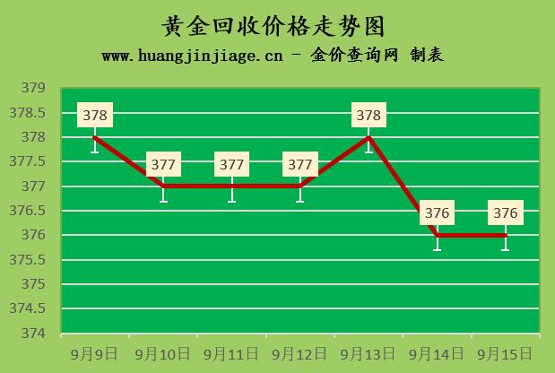 黄金回收价格376元/克,铂金回收价格177元/克,钯金回收价格406元/克,18K金回收价格274元/克,银条回收价格3.2元/克。(黄金行情是波动的,另外每个回收商价格有差异)