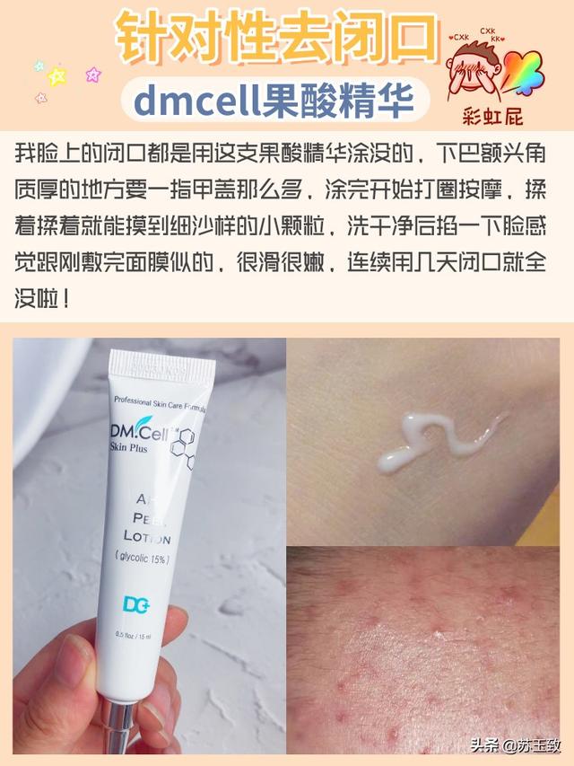 我脸上的闭口都是用这支果酸精华涂没的,下巴额头角质厚的地方要一指甲盖那么多,涂完开始打圈按摩,揉着揉着就能摸到细沙样的小颗粒,洗干净后掐一下脸感觉跟刚敷完面膜似的,很滑很嫩,连续用几天闭口就全没啦!