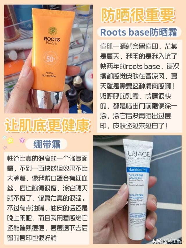 痘肌一晒就会留痘印,尤其是夏天,我用的是我入坑了快两年的roots base,每次擦都感觉皮肤在冒凉风,夏天就是需要这种清爽感啊!奶呼呼的乳霜,成膜很快的,都是临出门前随便涂一涂,涂它后没再晒出过痘印,皮肤还越来越白了!