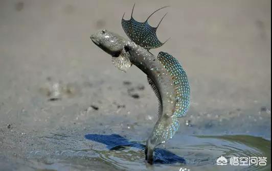 跳跳鱼只是人们形象的叫法,其实它的学名叫弹涂鱼,是进化程度较低的古老两栖动物,它身上有灰褐色的花斑,长得像鱼又像蜥蜴,头很大,双眼凸出,大眼睛咕噜噜的乱转,嘴巴一鼓一鼓的,一看就生性狡猾~