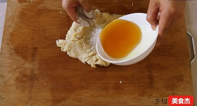 在面团上按一个坑,放少量的面粉和油做成油酥,揉进面团里。