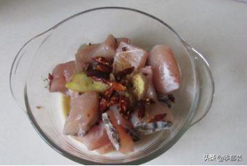 1.将鱼肉剁成长5厘米、宽3厘米的鱼块置小盆中,加入适量大葱、花椒、老姜、干辣椒、盐、料酒调和成腌渍调料;