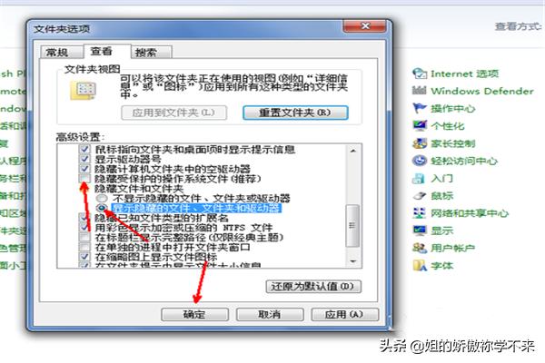 4、在查看标签中,向下拖动右边进度条,找到隐藏受保护的操作系统文件这个选项,将前面小方框中取消选定,然后会有一个提示,不要管它,直接确定,然后再选定显示隐藏的文件这个选项。设置完成,点击确定退出。