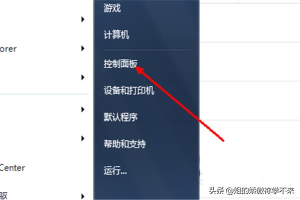 1、首先打开控制面板,在开始菜单中,右侧的菜单选项中。如图所示。