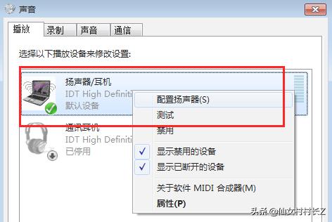 3、不显示任何设备如果点击打开什么设备都没有,在空白处选择“显示禁用设备”“显示已断开设备”,勾选好之后,应该能看到有设备了。启用之后,如果还不行,点击选择需要配置的设备,配置扬声器(如果有多个设备,选择正确的设备并且设置为默认设备)。