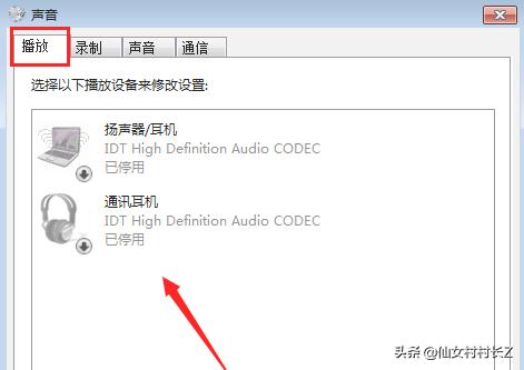 2、在小喇叭图标(如果没有到控制面板-声音里面去查找)右键----播放设备。随后打开的播放声音设备中,如果显示有个黑色小箭头的图标,表示您把当前的设备给禁用了。选择设备右键--启用即可。