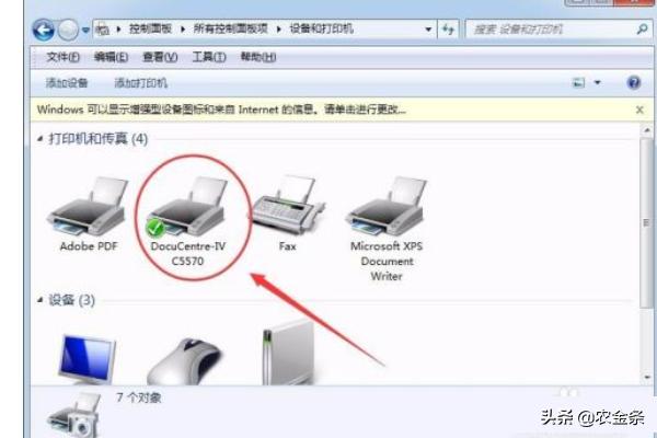 3、如果是联机不正常,您可以打开电脑的控制面板找到打印机是否有绿色的勾选标识;联机不正常可以通过重装驱动的方式,或者重启电脑的方式尝试一下能否解决。