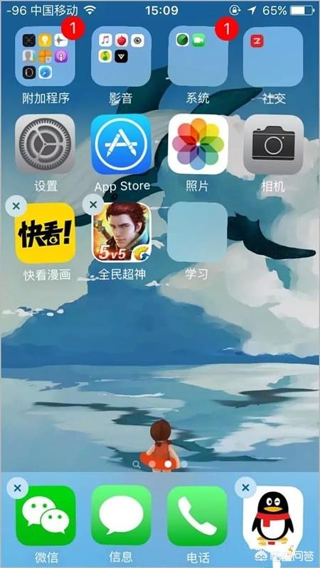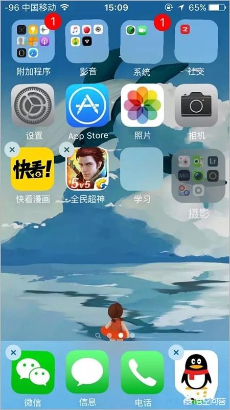 4、把文件夹摄影放入文件夹2,再按 Home 键返回主屏幕,这样你就会发现文件夹1从屏幕上“消失了”,至少不能直接看到了。