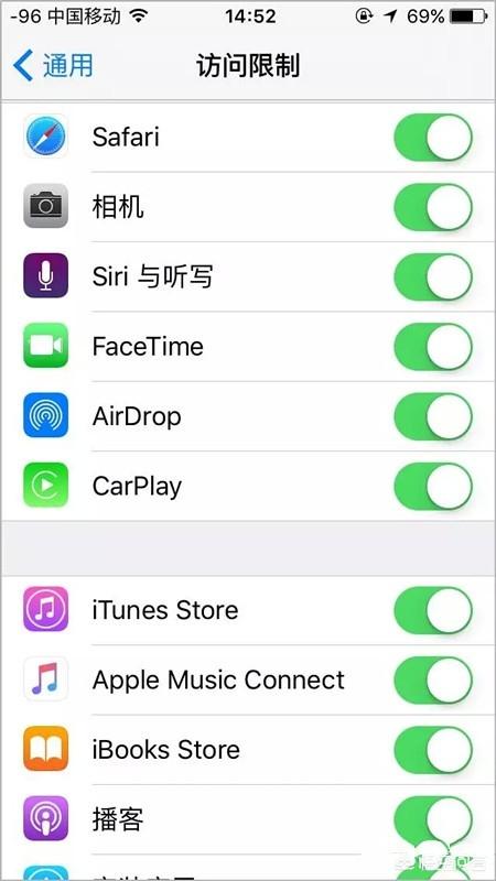 出现“输入访问限制的密码”的提示之后,输入访问限制密码。然后在“允许的内容”分组下面,关掉应用图标旁边的开关,即可隐藏应用。