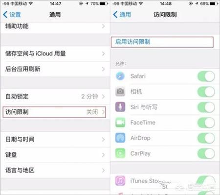 1、前面的步骤如同第一招,打开【设置】-【通用】-【访问限制】-【启用访问限制】。(此方法恢复后会打乱应用原有顺序,强迫症患者请谨慎使用)