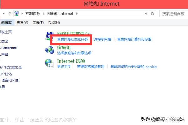 3、在打开的网络和Internet的界面中,单击“查看网络状态和任务”选项。