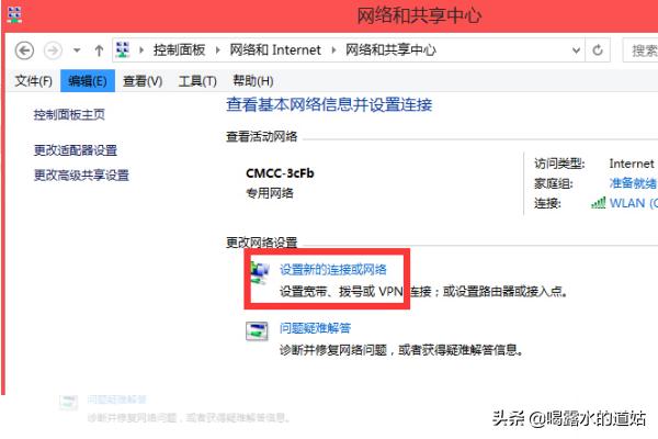 4、打开的“网络和共享中心”页面中,单击“设置新的连接或网络”。