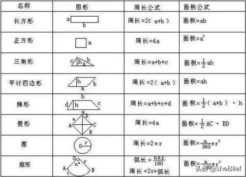 正方形面积公式为边长的平方;长方形面积公式为长乘以宽;平行四边形面积公式为底边长乘以高;圆面积等于圆周率乘以圆半径的平方;三角形面积公式为底乘以高除以2。