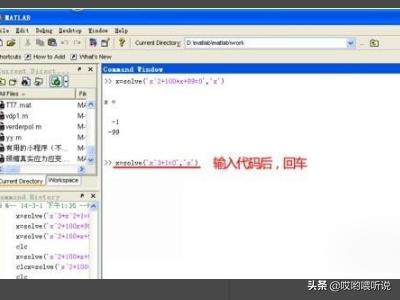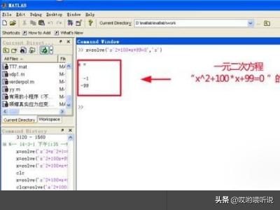 2022-07-08 18:09 阅读: 评论:1、先举一例,解方程“x^2+100*x+99=0”。 在Matlab ”Command Window“中输入如下命令:x=solve(‘x^2+100*x+99=0’,‘x’),见下图。