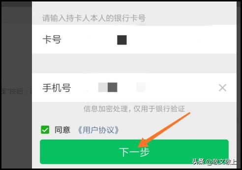6、点击后,跳转到绑定银行卡界面,输入微信绑定的银行卡。如下图所示。