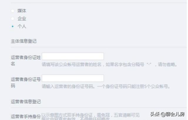 2、主体类型选择个人比较简单,填写自己的资料姓名手持身份证照片。填写自己的手机号码,接受验证码。