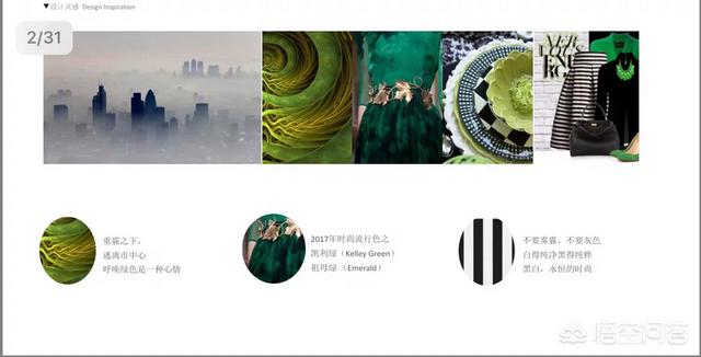 以我2017年底的一个样板间项目为例:项目购买主体为30-40岁的改善客户,房价中上,有一定的品质追求,项目位置中心城以外,当年雾霾严重,项目主推环境优势。我当时的设计理念是绿意盎然,以时尚流行色凯利绿、祖母绿结合黑白纹样设计的ART DECO风。理念提炼详细如图。