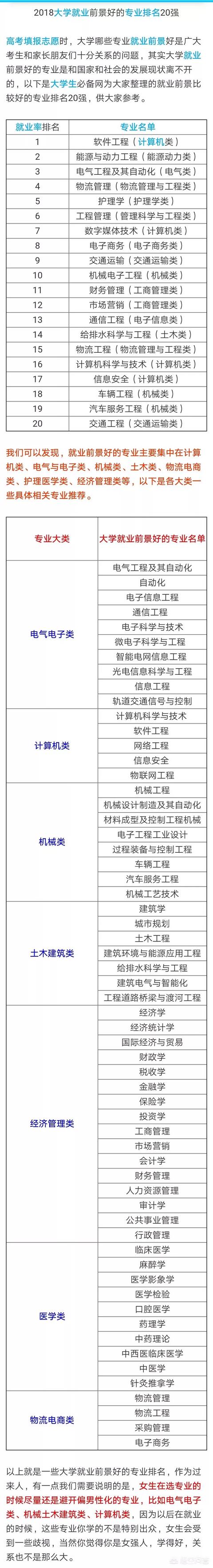 当然,某个专业是否好就业和国家的经济发展形势是紧密相连的,比如随着我国高铁事业的快速发展,与之相关的专业就非常火爆;再如网络科技的飞速发展,也需要很多相关的人才。根据中国教育在线的统计,目前就业率高的专业有电气工程及其自动化、计算机科学与技术、财务管理、机械设计制造及其自动化、土木工程、会计学、国际经济贸易、英语、金融学、艺术设计等。我还从大学生必备网搜集到一些数据,供题主参考,具体专业请看下面的截图。