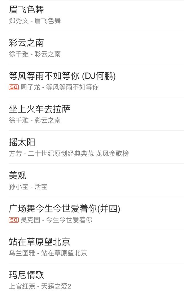 如果您上了一定年龄,那我推荐:《坐上火车去拉萨》《纳西情歌》《你做了谁的情人》《凤凰飞》《我爱草原我爱你》《花心传说》《山里红》《绿旋风》《今夜舞起来》《马头琴》《中国美》《彩云之南》《你是我的草原》《年轻的朋友来相会》