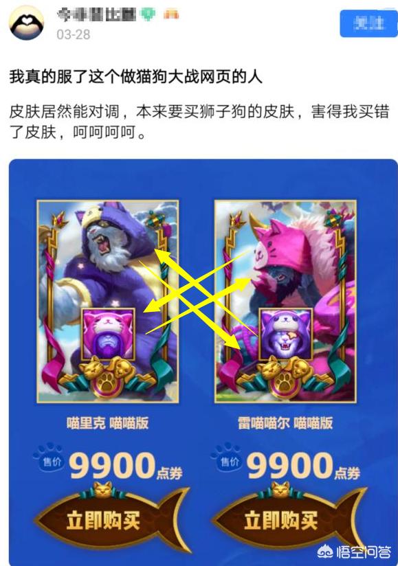 2022-09-22 01:13 阅读: 评论:英雄联盟在9.6新版本当中也是上线了猫狗大战系列的皮肤。作为本次的主角,狮子狗和约里克的皮肤也是受到了玩家们的青睐,有不少网友已经准备自掏腰包,准备购买了。但这位网友在购买的时候却出现了一些小小的插曲,导致想要的皮肤互换,着实有些尴尬。