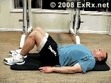 身体仰卧于地垫上,膝部屈曲成90度左右,放松背肌和脊柱,两腿并拢并伸直,脚部平放在地上。抬起身体,下背部不离地,双手伸展去够小腿,然后回原,重复。