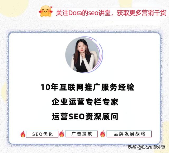 我是Dora,10年谷歌推广服务经验,为7-Eleven、微软、腾讯等集团提供营销顾问服务。推广不走弯路,帮你找到适合自己的渠道。