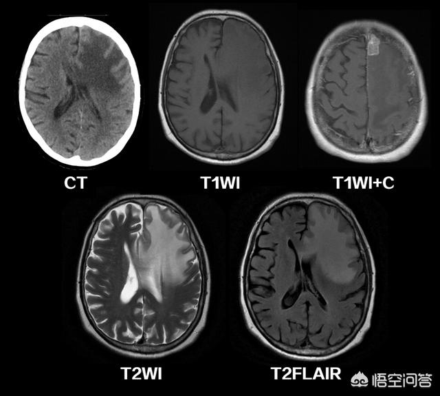 (血管源性脑水肿,CT和不同形式磁共振扫描的结果对比。)