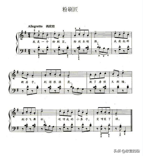 扩展资料:《粉刷匠》是一首风趣、活泼的波兰儿童歌曲。旋律使用重复的手法,简单而且易唱易记,并以"xxxx∣xxx∣xxxx∣x-∣”的节奏贯穿全曲。轻松风趣的旋律与幽默诙谐的歌词相结合,一方面生动地描绘了小粉刷匠在观赏自己的劳动成果,得意炫耀自己劳动技术的同时,表现了小粉刷匠一心只顾劳动,弄得鼻子也刷上了白灰的顽皮神态;一方面教育学生热爱劳动和乐观向上的精神。