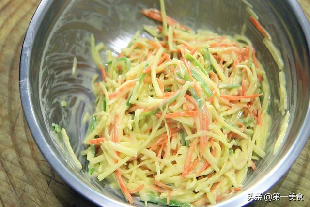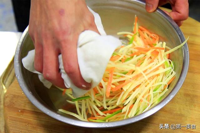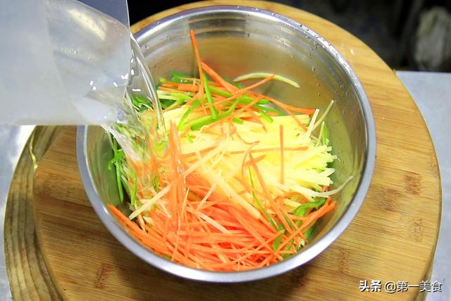 2.胡萝卜半根,也切成细丝;再切一点青椒丝,放在一起用来配色。把切好的食材全部放入清水中洗干净,然后沥干水分放入盆中。