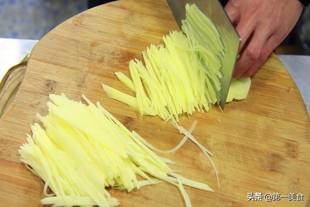 1.首先,我们准备土豆两个,把外皮削干净,先切成薄片,再切成细丝。