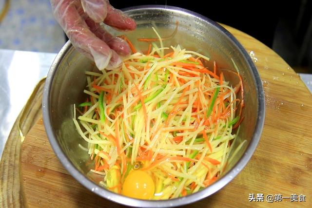 4.盆中加入一勺食盐、两勺鸡精、一勺白糖提鲜、再放入少许胡椒粉抓拌一下,让调料均匀裹在土豆丝和胡萝卜丝上面,再淋入适量的香油抓匀,以免烙制的时候配菜大量出水。再打入一个鸡蛋,使劲的抓揉一会,把土豆和胡萝卜丝抓软、抓出水分。